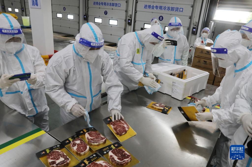 记者在现场看到,当运输进口冷链食品展品的车辆到达后,工作人员马上对司机进行健康码核验和体温检测,并对车辆进行消毒。装卸过程中,司机实行“非必要不下车”。货物入库时,在完成外包装消毒后,工作人员将展品拆除外包装,对内里的小包装进行消毒、核酸检测,再重新装箱、贴标签、放入暂存库,之后再转入合格储存库。