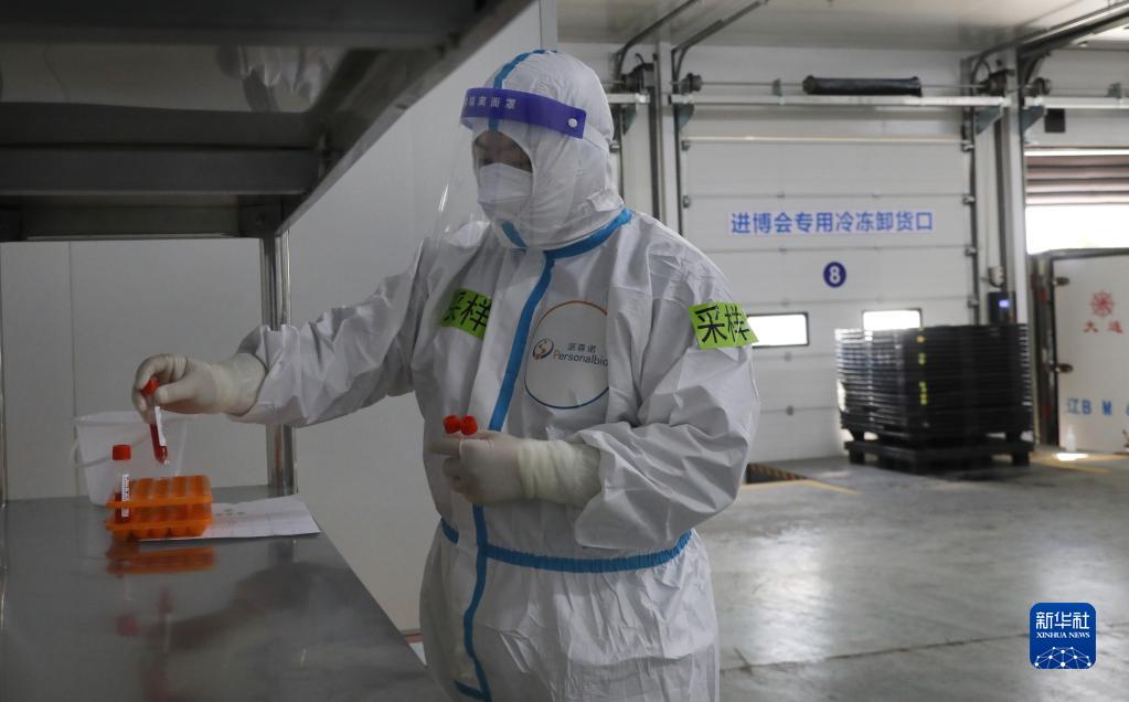10月20日,一名核酸采样工作人员在放置入仓的冷链食品展品核酸样本。新华社记者 方喆摄