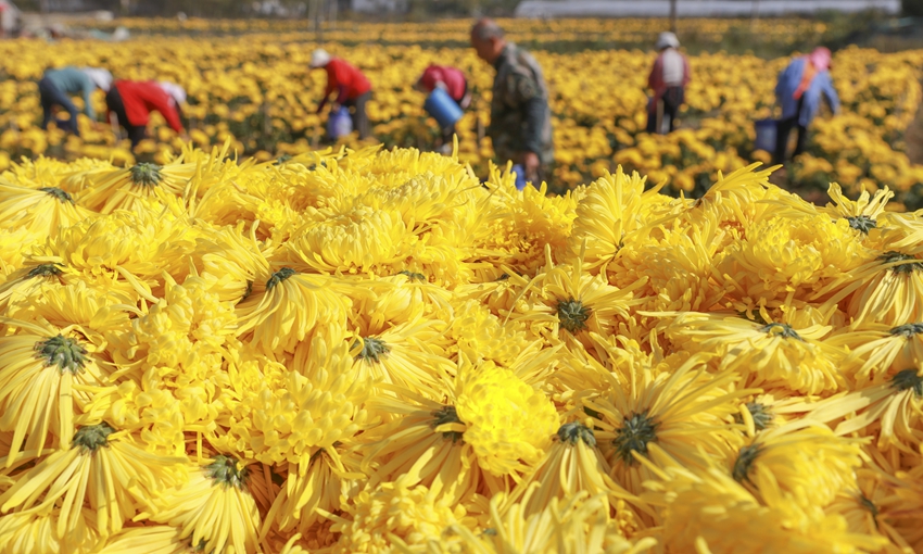 时下,江苏省句容市边城镇金丝皇菊种植基地内,农户们穿梭在金色的花海中忙着采收。近年来,当地采取“公司+基地+农户”的模式,积极引导农户种金丝皇菊,亩均收益在3万元左右,把金丝皇菊发展成了带动村民致富的特色产业。(杨志国、笪倩倩、马晓波)