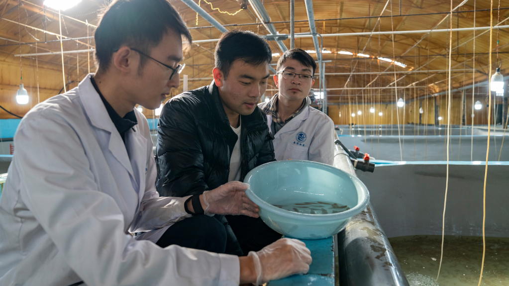 程佳禹(中)和中国水产科学研究院黄海水产研究所科研人员观察“鳎优1号”鱼苗生长情况。(受访单位供图)