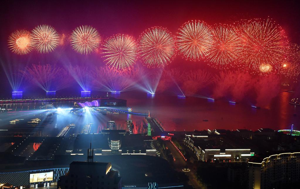 这是上合组织青岛峰会期间举行的《有朋自远方来》灯光焰火艺术表演。新华社记者 李紫恒 摄