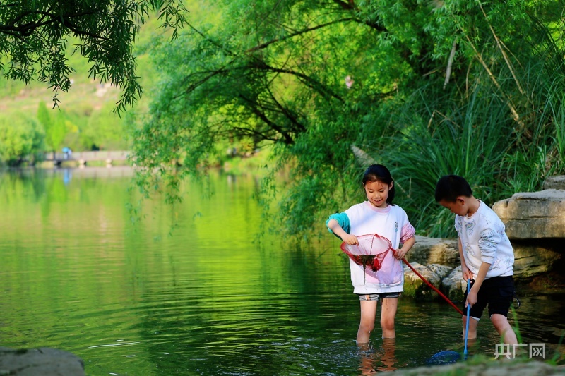 在贵阳市花溪区,孩子们在清澈见底的小溪边玩耍(央广网记者 栾小琳 摄)