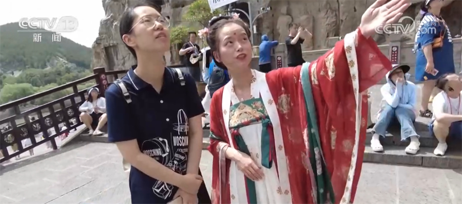 记者 徐倩:在龙门石窟,我发现一个很特别的点,往年来这里,都是导游来陪大家一起逛龙门石窟、来讲解。今年的导游做了一个服务升级,会穿着这种比较有特色的唐装。