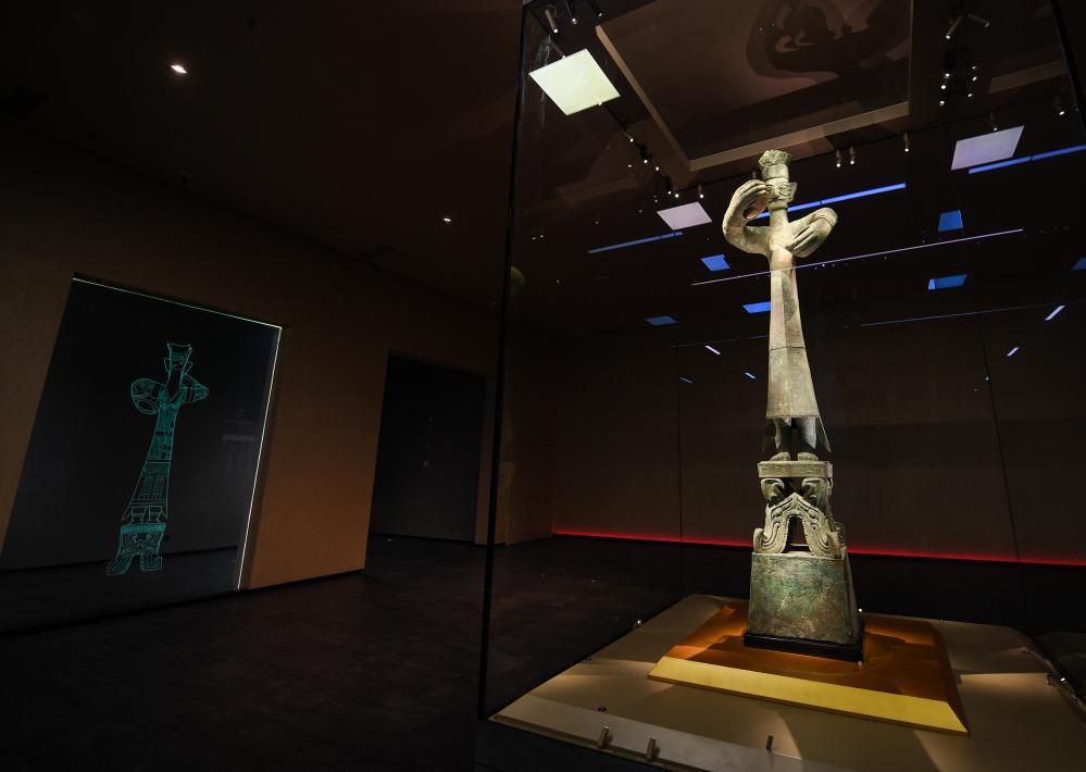 这是日前在四川省三星堆博物馆新馆拍摄的青铜大立人像。新华社记者 王曦 摄
