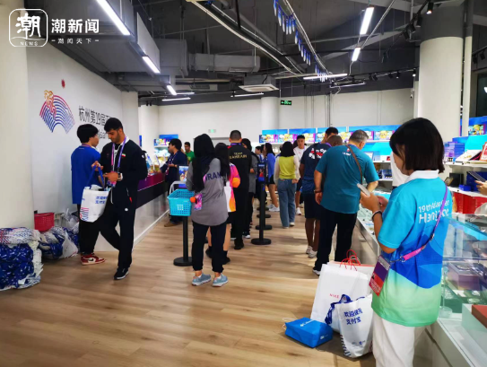 运动员村的亚运特许商品店里,运动员们排队结账。记者 纪驭亚/摄