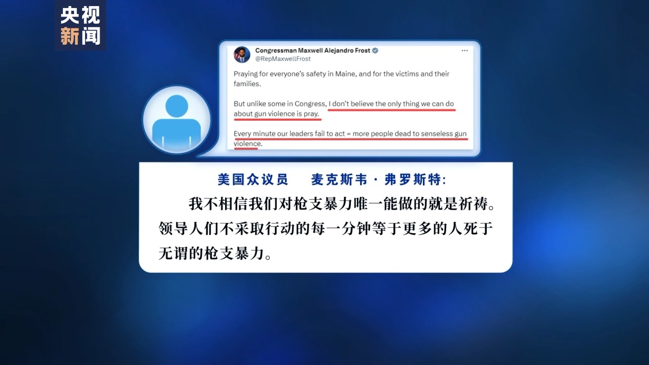 此外,每次枪击案发生后,美国拥枪派政客都重复着空洞的安慰,这次也不例外。在多位拥枪派政客的社交媒体上,各种口头安慰和无力的陈词滥调比比皆是。对此,美国众议员麦克斯韦·弗罗斯特(Maxwell Alejandro Frost)发推文写道,“我不相信我们对枪支暴力唯一能做的就是祈祷。领导人们不采取行动的每一分钟等于更多的人死于无谓的枪支暴力。”