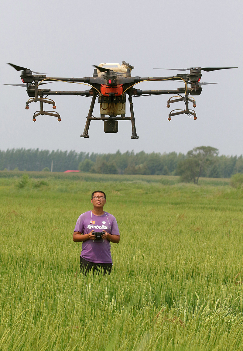 2021年7月27日,哈尔滨呼兰区腰堡村的一片稻田间,忠萍农作物种植专业合作社的“飞手”正在操纵无人机对水稻喷施叶面肥。