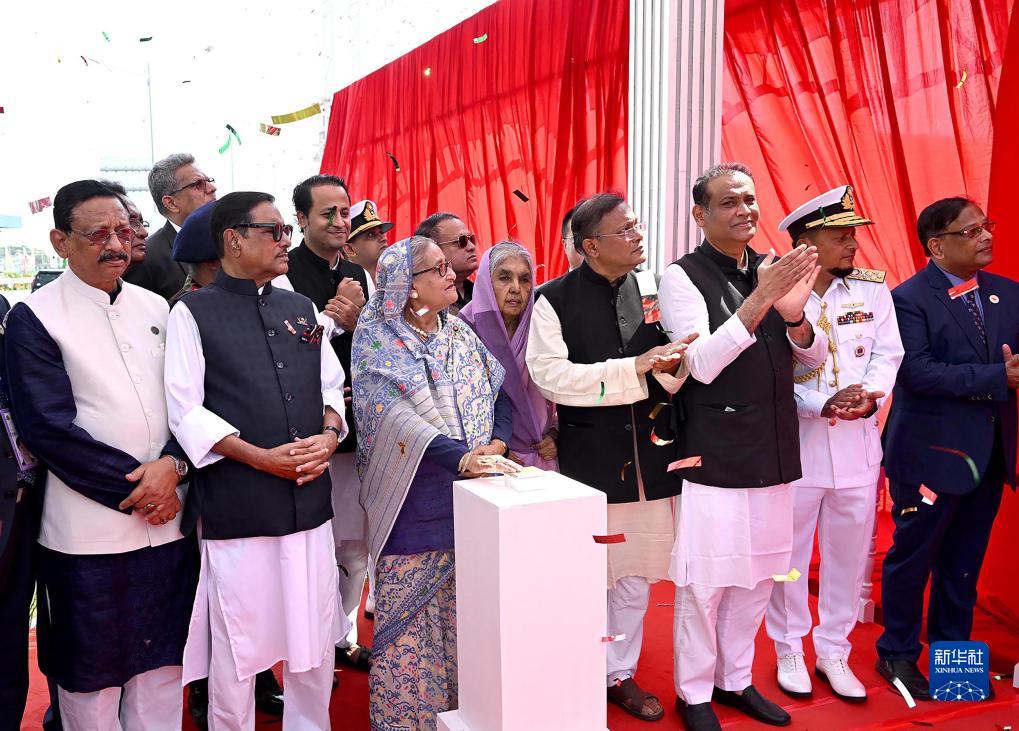 10月28日,在孟加拉国吉大港市,孟加拉国总理哈西娜(前排左三)出席卡纳普里河底隧道通车仪式。