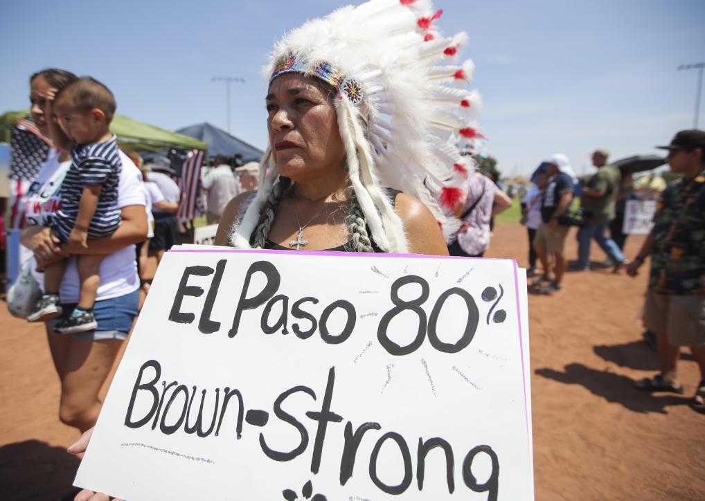 2019年8月7日,在美国得克萨斯州埃尔帕索市,印第安裔美国人普丽西拉·佩雷斯手举标语参加反种族主义集会。新华社记者王迎摄