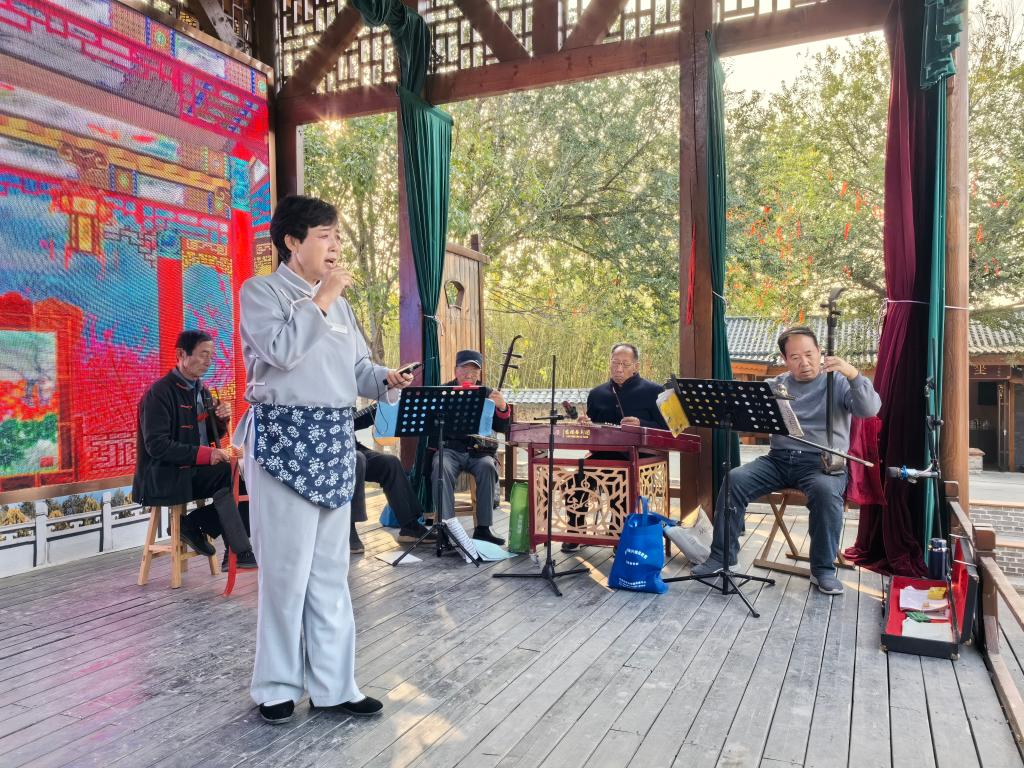 山东省东营市利津县盐窝镇南岭村的老戏台上,村民正在表演传统曲艺。新华社记者 袁敏 摄