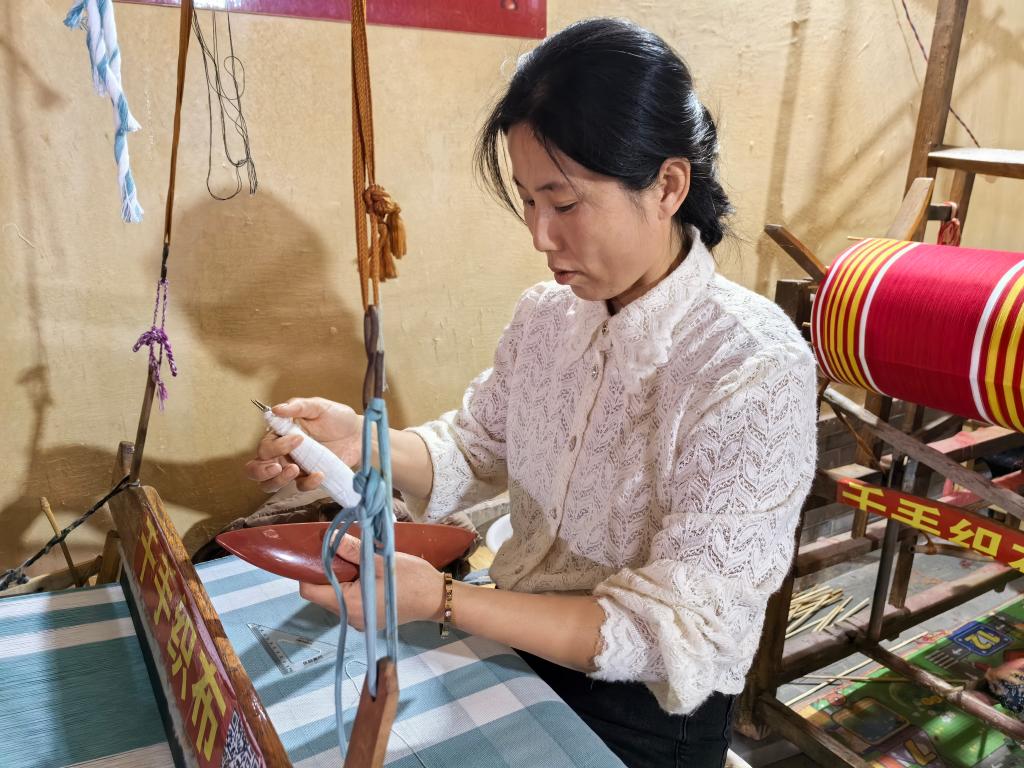 “这种古法老粗布每米价格24元左右,我一天可以织10多米。”陈翠英说,她忙完家务常来这里织布。这里的工作方式很“原始”,织布机、纱线由店里免费提供,村民有空就来织布,每织两床给店里留下一床,另一床自己拿走当“报酬”,自用或售卖都可以。