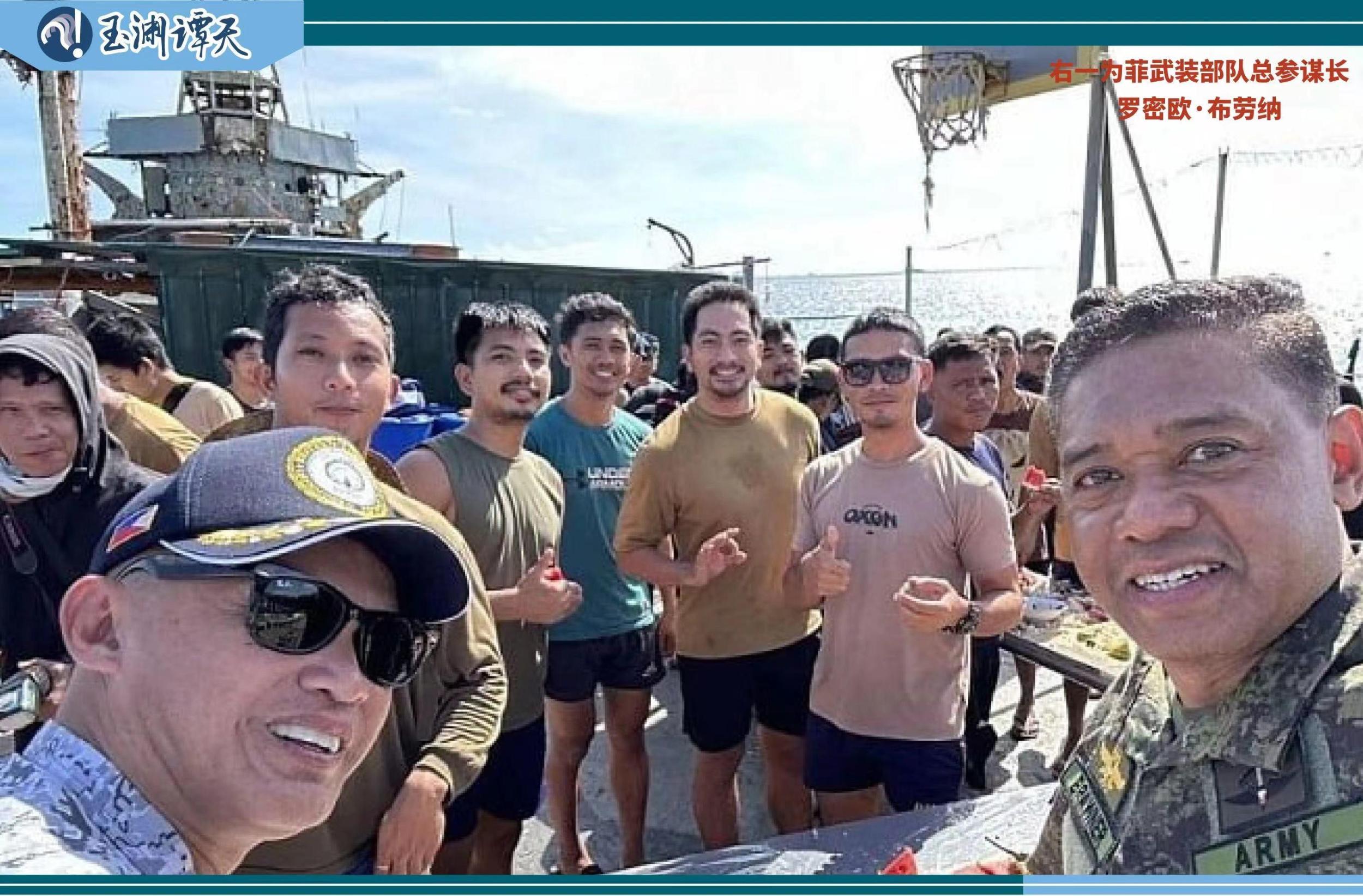 而菲武装部队的总参谋长,就藏在这条运送生活物资的船上。在混上非法“坐滩”军舰后,这位总参谋长拍了一张照片,而菲律宾媒体对这张图进行了大肆炒作,称总参谋长“视察”了自己的部队。