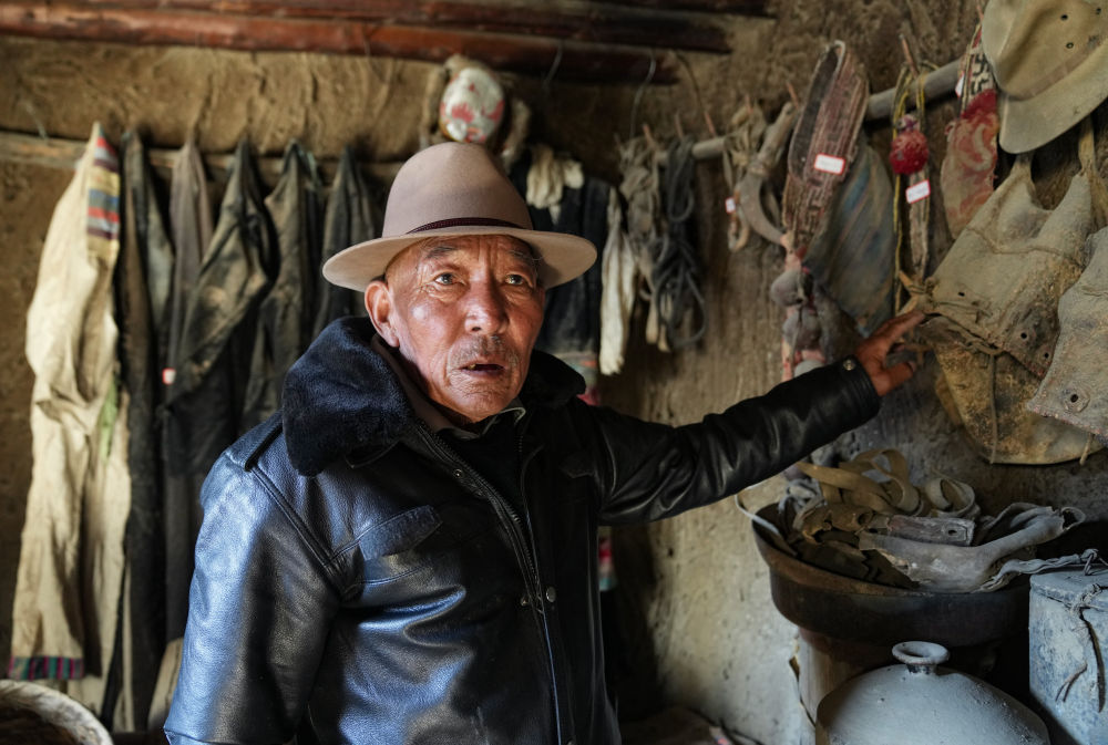 虽然背有点驼,听力也差,79岁的朗杰老人仍坚持戴着礼帽,衣着得体,精神矍铄。讲起从前的事情,老人思路很清晰,表达也有力。