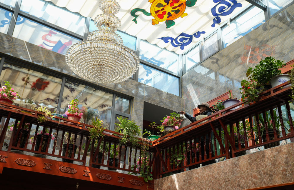 2024年3月14日,嘎东社区居民朗杰在自家二楼给花浇水。新华社记者 晋美多吉 摄