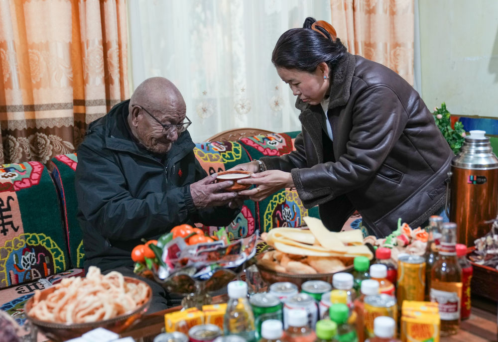 2024年3月14日,在位于嘎东社区的家中,儿媳普赤给益西桑珠(左)敬茶。新华社记者 晋美多吉 摄