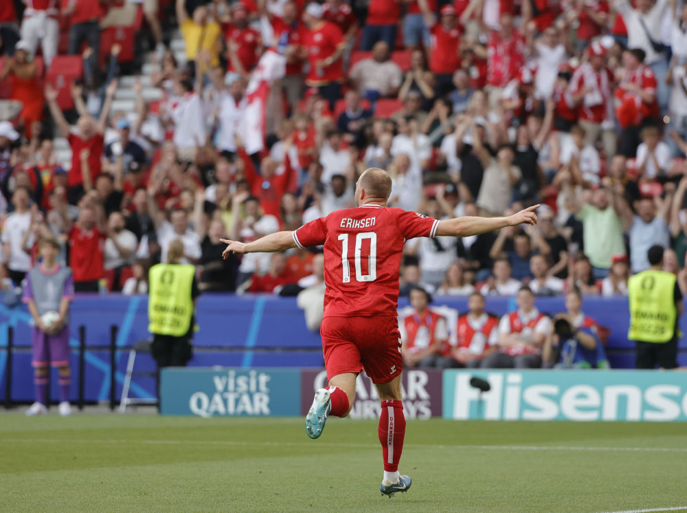 6月16日,丹麦队球员埃里克森进球后庆祝。新华社发(菲利普·鲁伊兹摄)