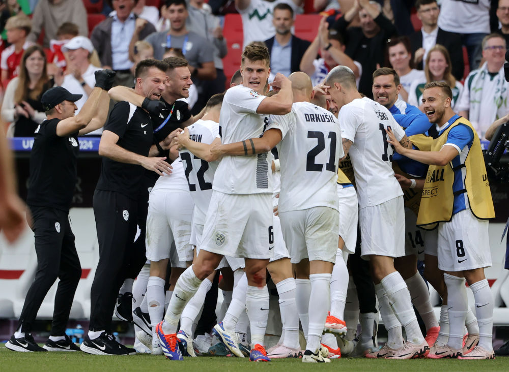 6月16日,斯洛文尼亚队球员庆祝进球。新华社发(菲利普·鲁伊兹摄)
