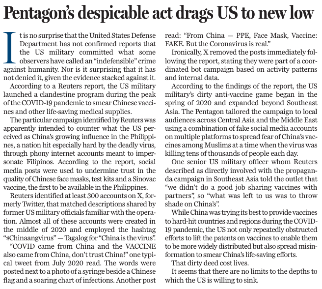 据路透社近日报道,美国军方在新冠疫情高峰期实施秘密计划,通过虚假网络账户,冒充菲律宾人,抹黑中国疫苗、口罩和其他医疗用品。