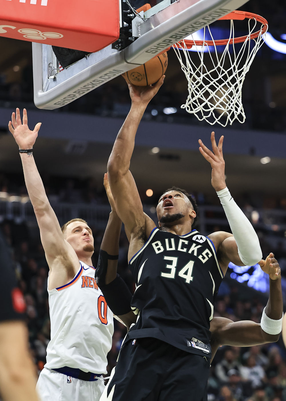 2024年4月7日,雄鹿队球员安特托昆博(右)在比赛中上篮。当日,在2023-2024赛季NBA常规赛中,纽约尼克斯队客场122比109战胜密尔沃基雄鹿队。新华社发(乔尔·莱纳摄)