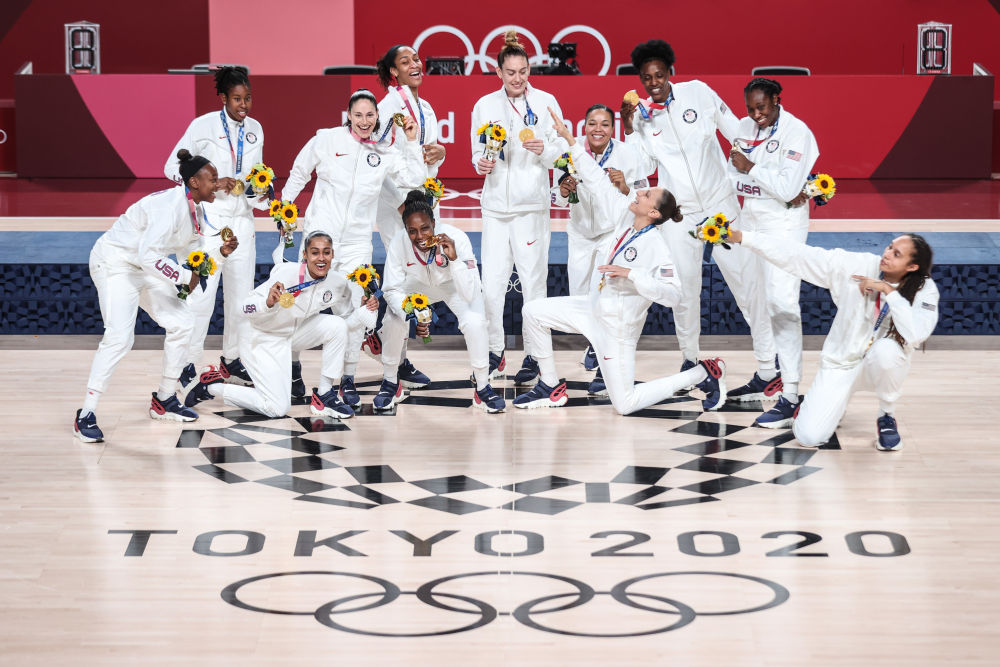 2021年8月8日,冠军美国女篮在颁奖仪式上。当日,在东京奥运会女子篮球决赛中,美国队战胜日本队,夺得冠军。新华社记者 潘昱龙 摄