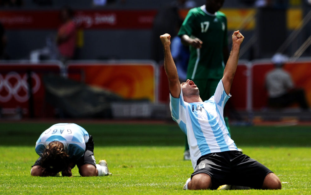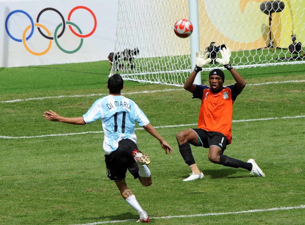 2008年8月23日,阿根廷队球员迪马利亚(左)破门得分。当日,北京奥运会男子足球决赛在国家体育场——“鸟巢”举行,阿根廷队迎战尼日利亚队。新华社记者 李钢 摄