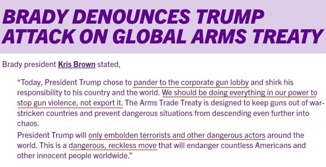“我们应竭尽全力遏止枪支暴力,而不是鼓励枪支出口……特朗普拒绝接受《武器贸易条约》只会让全世界的恐怖组织和其他危险分子更加猖狂,这是一种危险、鲁莽的做法,将危及无数美国人和其他无辜的人。”