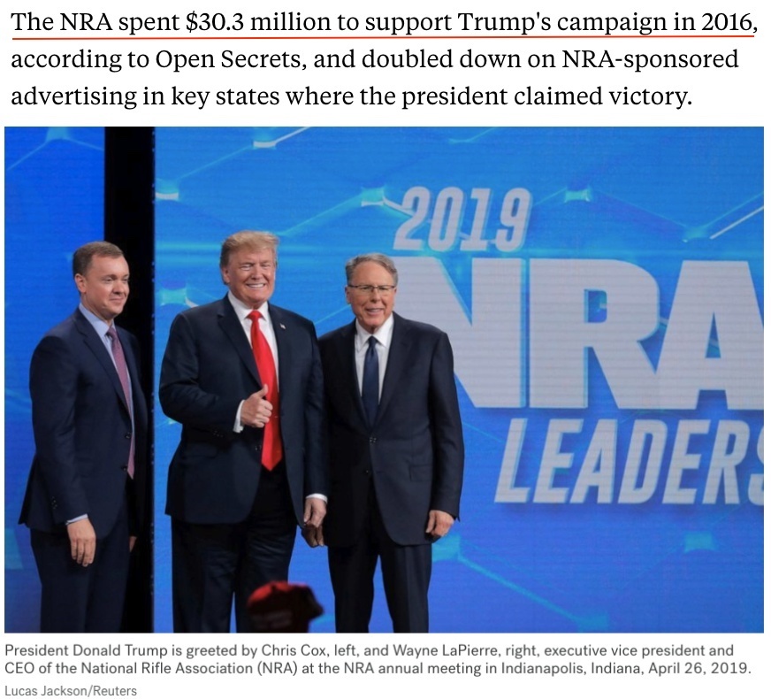 △美国广播公司网站:据调查,全国步枪协会在2016年花费了3030万美元支持特朗普的竞选活动,并在特朗普声称获胜的关键州加倍投入了全国步枪协会赞助的广告。
