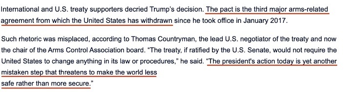 该条约的美国首席谈判代表、现任美国军控协会负责人托马斯·康特里曼认为,特朗普此举“又迈出了错误的一步,会让世界变得更不安全,而不是更安全”。