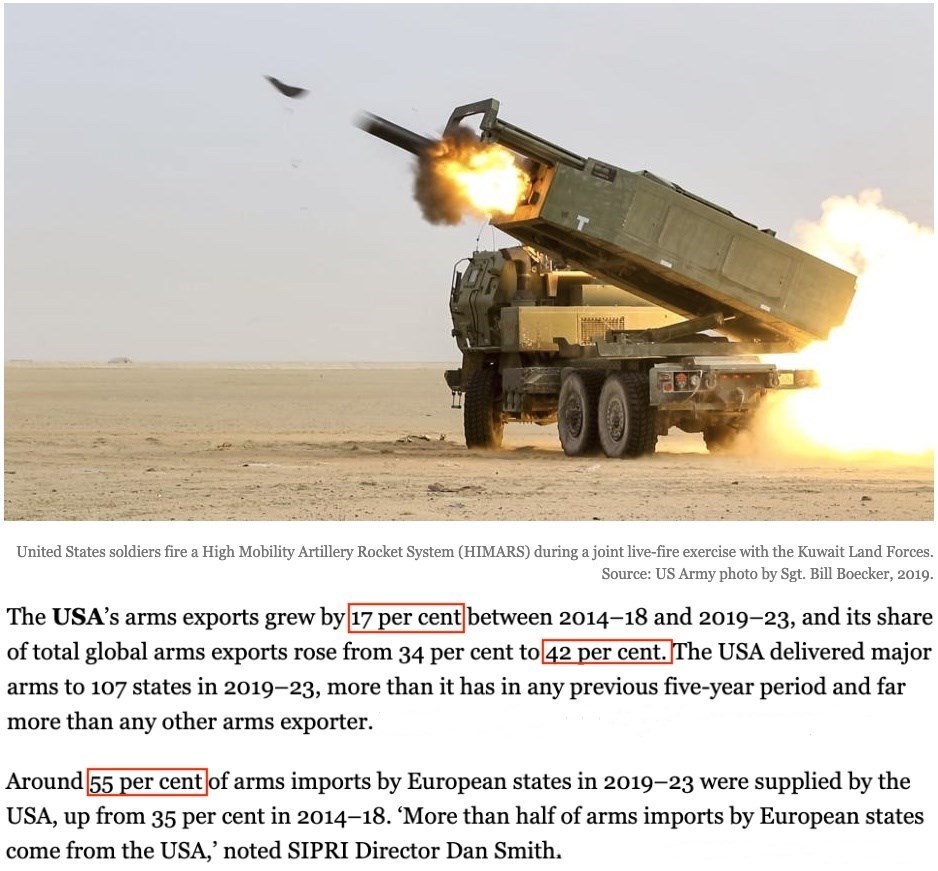 据统计,美国的武器出口在2019-2023年的过去五年里增加了17%,在全球出口量中占比高达42%,继续稳坐世界头号武器出口国交椅。而在这五年中,欧洲进口武器中有55%来自美国,比前一个五年大幅增加了35%。