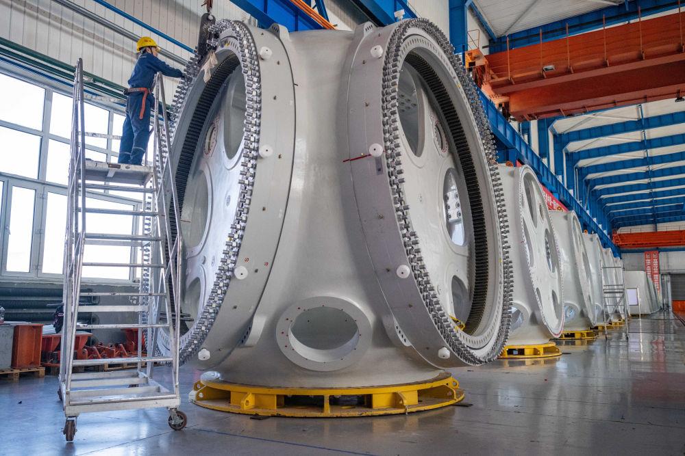 △2024年4月28日,工作人员在中国一重集团有限公司的风电设备装配车间内加工风电轮毂。