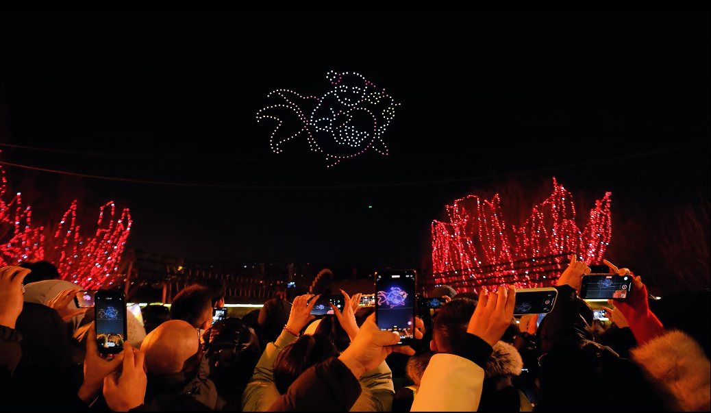 御河桥上的无人机年画空中秀,350台无人机不断变换队形,传统文化与现代科技交相辉映,赢得现场观众的阵阵喝彩。