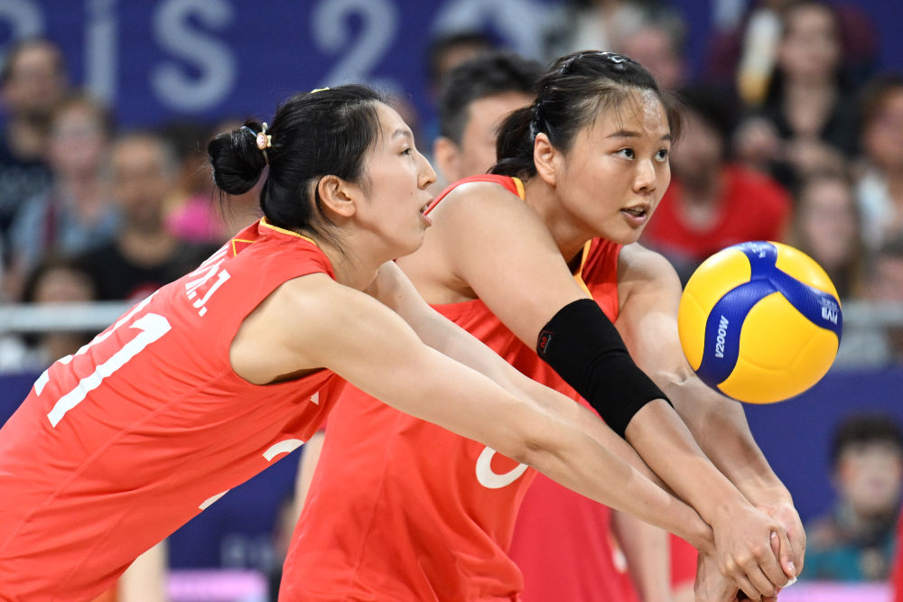 在巴黎奥运会女子排球四分之一决赛中,中国队队员吴梦洁(左)与龚翔宇在比赛中救球。新华社记者 刘大伟 摄