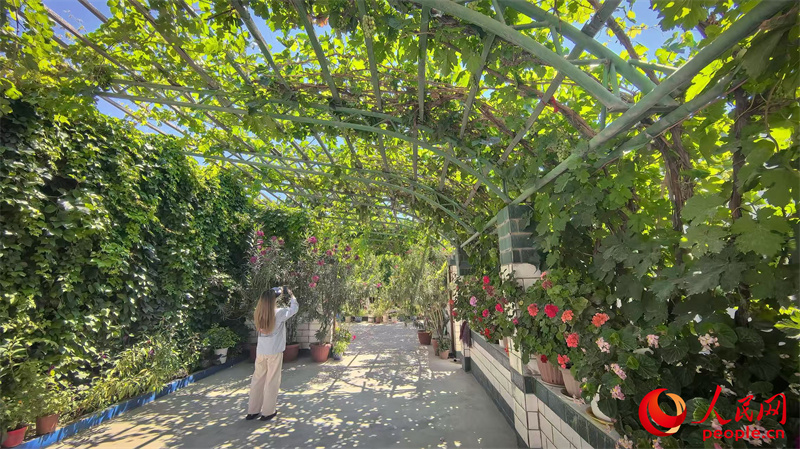 康村民宿院子里的葡萄熟了,鲜花正开得艳丽。人民网记者 陈新辉摄