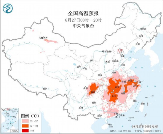 预计8月27日白天,河南中南部、安徽大部、江苏中南部、上海大部、湖北中东部、湖南大部、江西、浙江中北部、四川盆地中东部、重庆中西部和东北部、广西东部、广东中西部以及新疆沿天山一带东部等地有35℃以上高温天气,其中,河南南部、安徽南部、江苏南部、湖北中东部、湖南中东部、江西北部、浙江北部、四川盆地中东部、重庆中西部等地部分地区最高气温在37℃以上,重庆、湖南东部、江西、浙江西北部等地局地最高气温可达40℃。