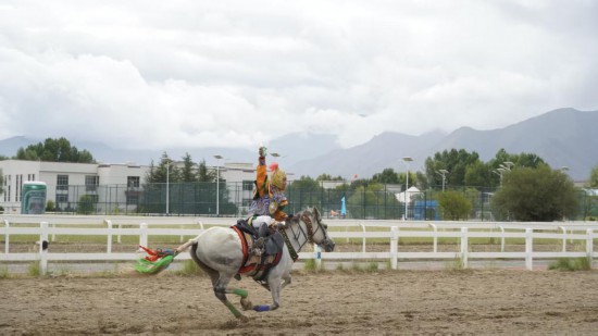 8月24日,西藏自治区马术队队员旦增尼玛在进行“马上敬酒”表演。 新华社记者 黄耀漫 摄
