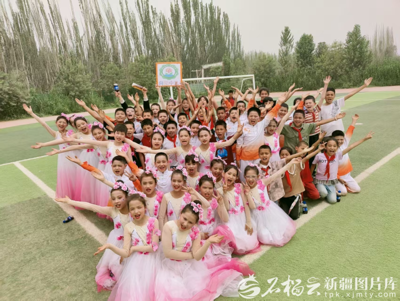和田县布扎克乡第一中心小学学生参加校园文化艺术节表演后合影留念。(资料图)