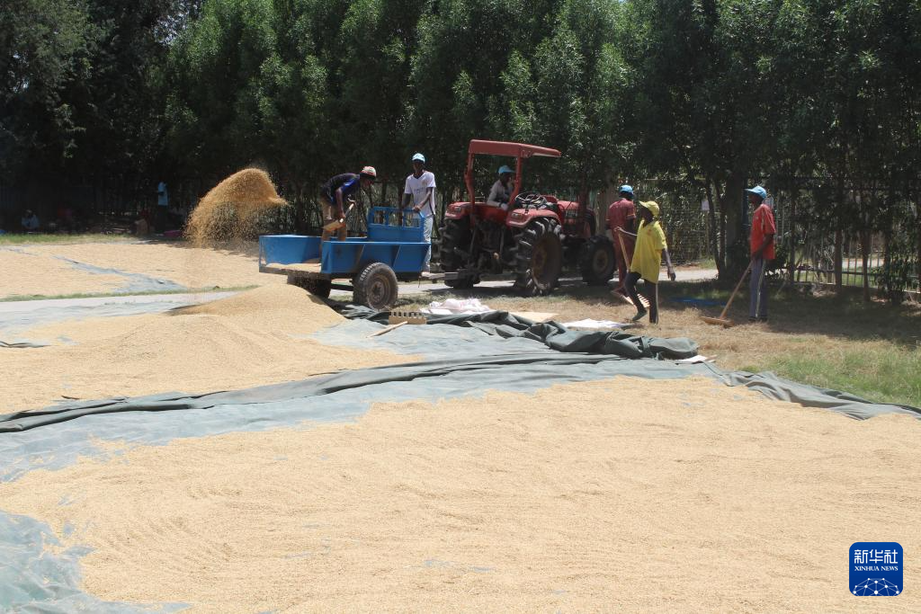 10月4日,在乍得哈杰尔-拉米斯省杜吉亚区米代金村的中国援乍得农业第八期技术援助项目基地,农民晾晒收割后的稻谷。新华社发(阿诺摄)