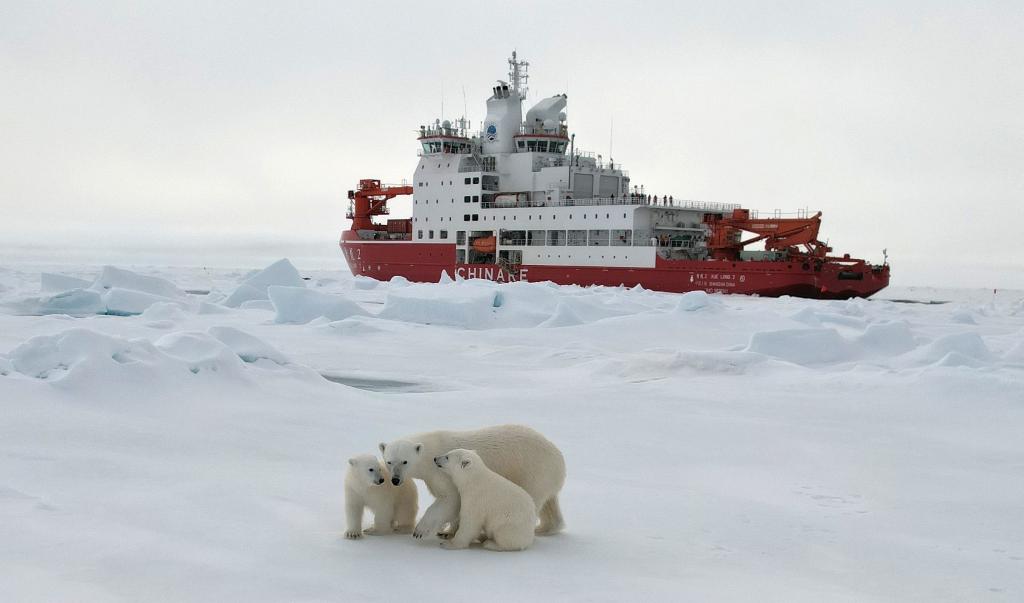 北极熊一家三口在“雪龙2”号船边休息玩耍。新华社记者刘诗平 摄