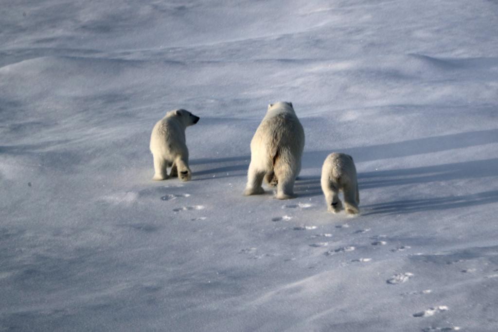 北极熊一家三口跑离考察队冰上作业区。新华社记者刘诗平 摄