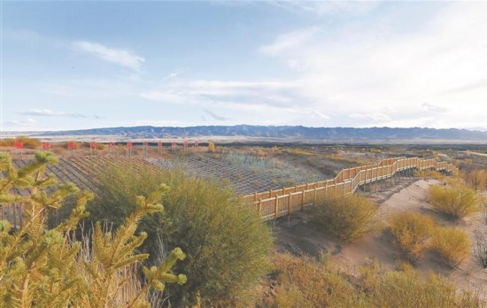 这是10月14日,记者在青海省海南藏族自治州贵南县“三北”攻坚阻击示范区拍摄的一角。几十年间,一代代治沙人艰苦奋斗,治沙植绿,通过压沙障,人工种植耐旱沙生植物,通过日复一日的治理,如今,在青海高原一幅幅生态画卷徐徐铺展。青海日报记者 张地委摄