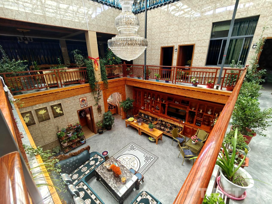 这处两层藏式民居,二层是家人整洁舒适的卧室,点缀着个性化的生活照片;一层是宽敞的客厅与厨房等,各类花卉绿植为室内增添了生机与温馨。整个居所干净明亮,与传统印象中的农居大不相同。
