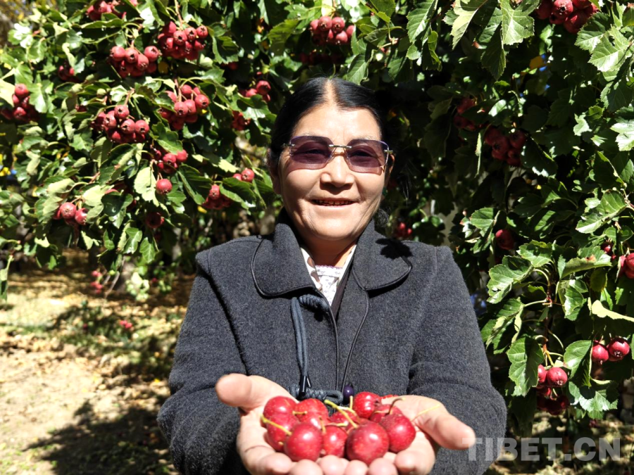 图为次仁措姆在自家院落中展示自种的山楂