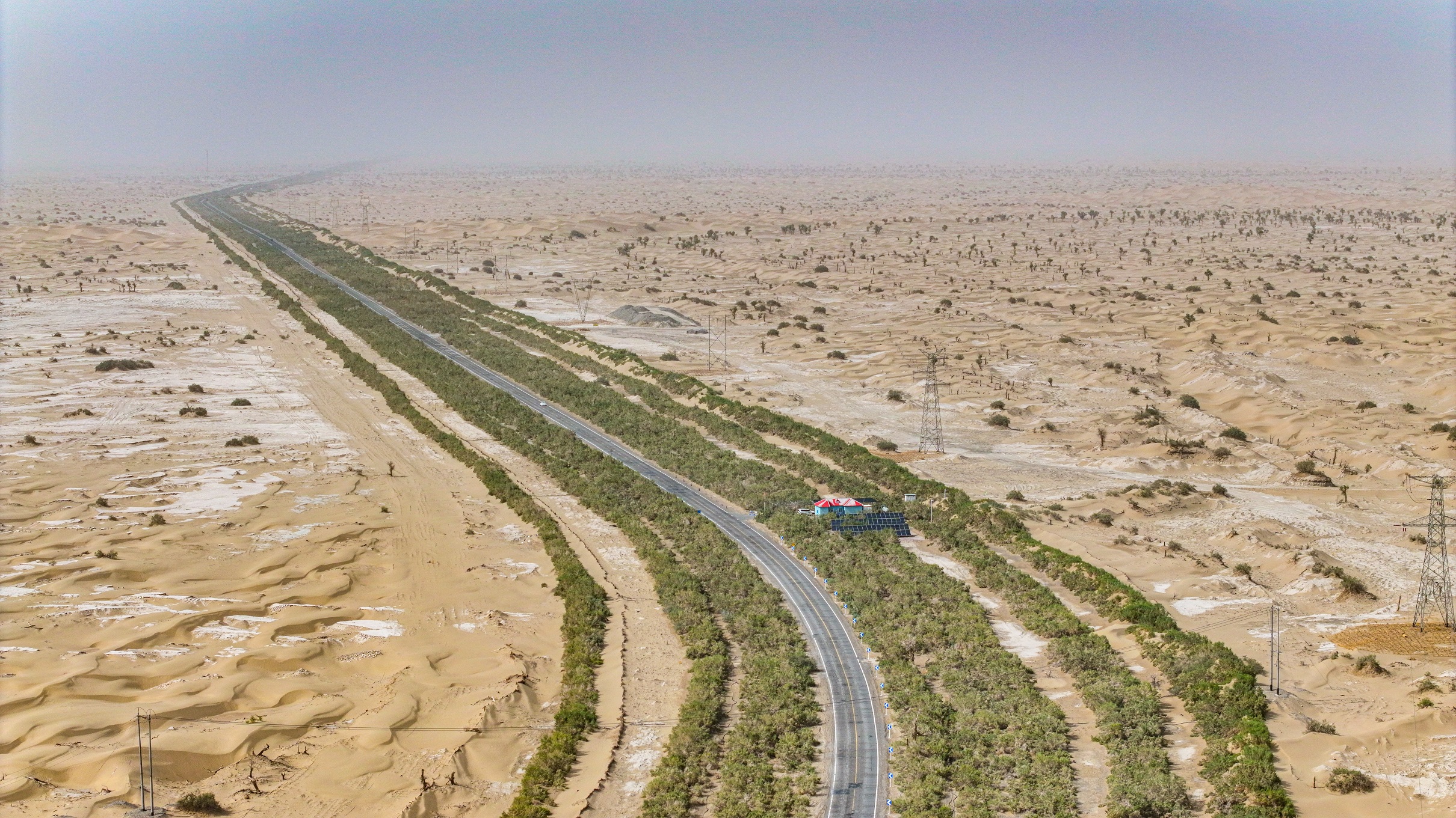 在防护林的护佑下,562公里的沙漠公路纵贯塔克拉玛干沙漠。王成凯 摄