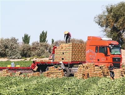 新疆维吾尔自治区哈密市伊州区南湖乡,农民在装运哈密瓜。