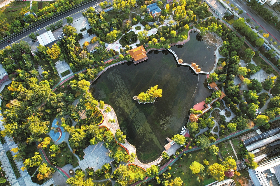 10月29日,阳泉市中心公园叠翠流金、湖桥映景、古建添韵,彰显“煤铁之乡”生态优先的宜居底色。(杜爱清摄)