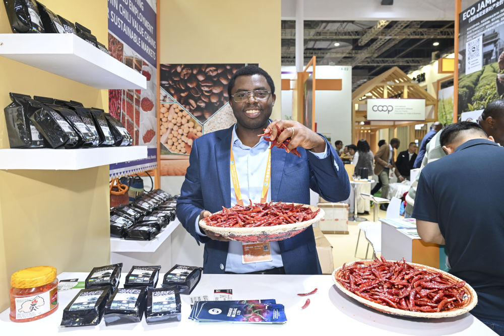 11月7日,卢旺达展商在第八届进博会展示干辣椒产品。新华社记者 陈浩明 摄