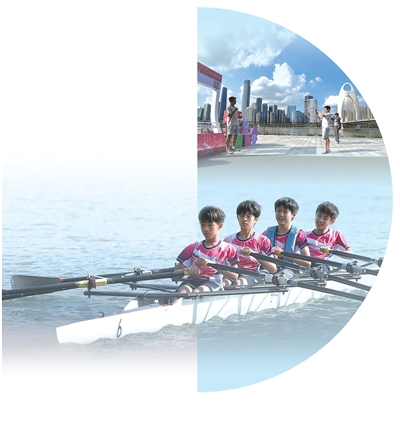 上图:游客在打卡装置前拍照留念。 十五运会和残特奥会广州赛区执委会供图 下图:赛艇学员在天沐河上训练。 新华社记者 胡星宇摄 |