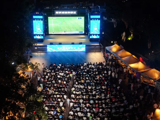 8月17日,球迷在南京一个露天屏幕前观看2025江苏省城市足球联赛(“苏超”)第九轮比赛。新华社记者 季春鹏 摄