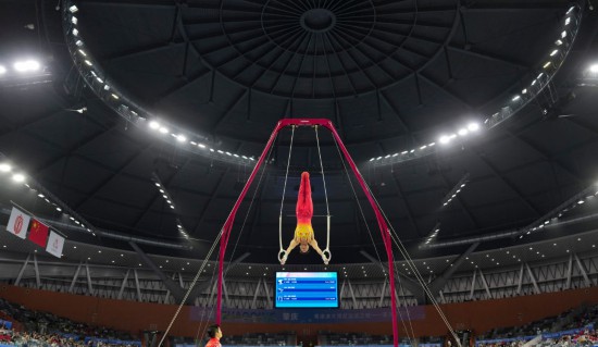 11月12日,江苏队选手孙炜在吊环比赛中。新华社记者 胥冰洁 摄