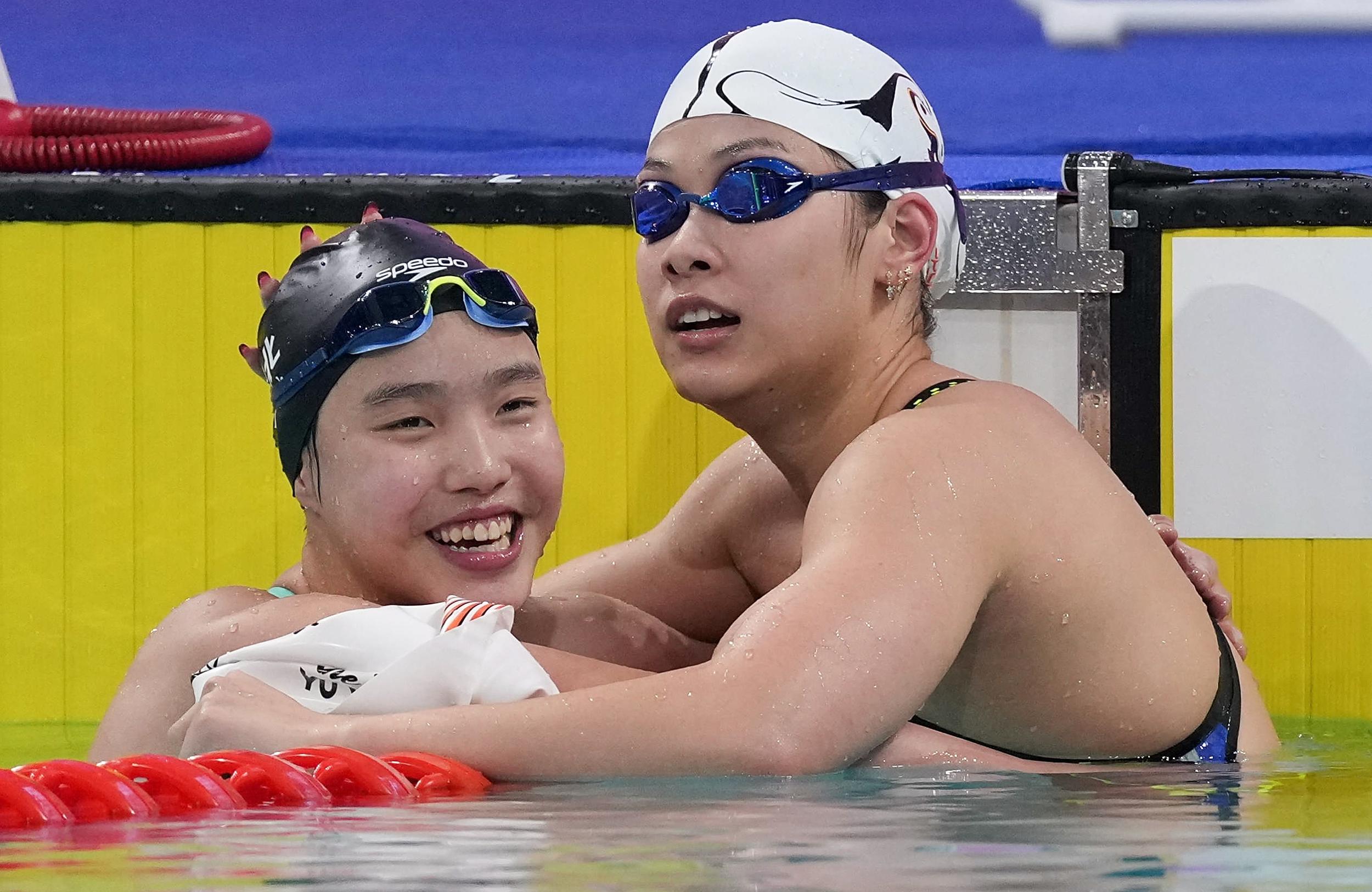 11月11日,河北队选手于子迪(左)在比赛后与浙江队选手余依婷拥抱致意。于子迪打破亚洲纪录获得冠军,余依婷获得亚军。新华社记者 薛宇舸 摄